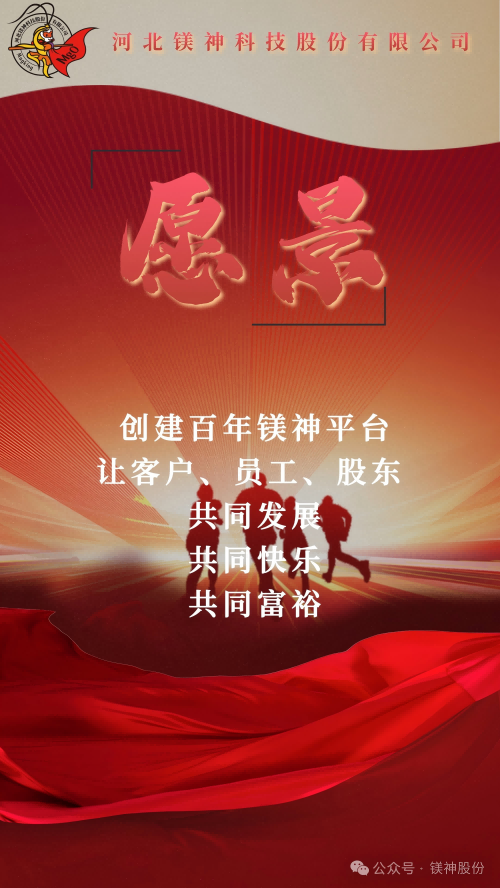 我們的企業愿景是:創建百年鎂神平臺,讓客戶、員工、股東共同發展、共同快樂、共同富裕。