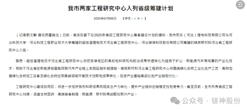 2025年7月8日,河北省發(fā)展和改革委員會正式公布了新一批河北省工程研究中心籌建計劃入選名單。由河北鎂神科技有限公司(簡稱:鎂神科技)牽頭籌建的“鎂質(zhì)新材料河北省工程研究中心”經(jīng)過嚴(yán)格遴選和專家評審,成功獲批立項,正式列入省級工程研究中心籌建計劃名單!這是鎂神科技發(fā)展歷程上的又一重要里程碑,也是河北省對我公司在鎂質(zhì)新材料領(lǐng)域創(chuàng)新能力與發(fā)展?jié)摿Φ母叨日J(rèn)可!